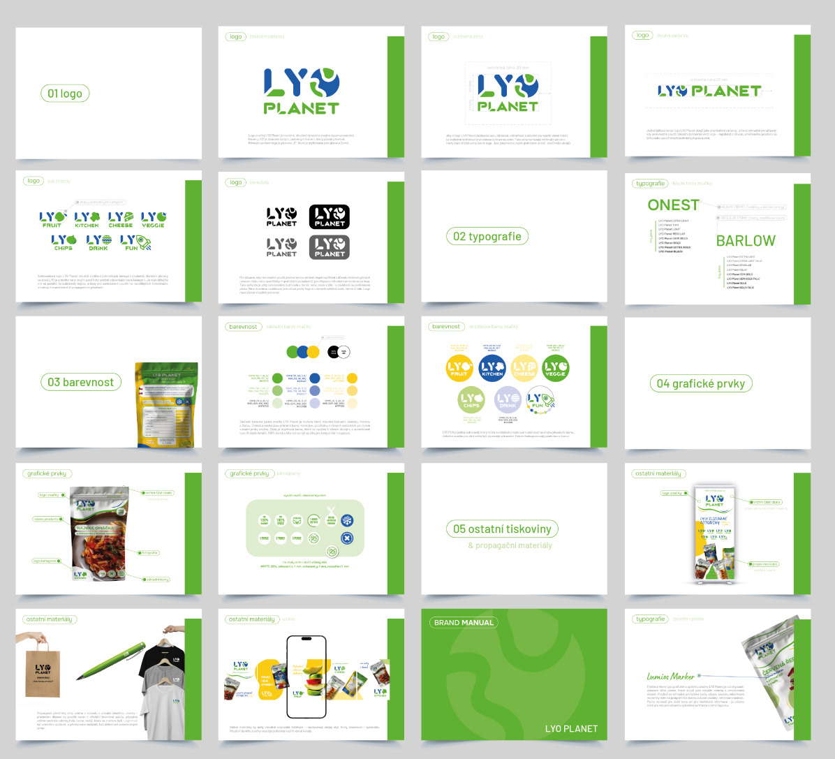 V roce 2025 jsme ve spolupráci se společností LYO Planet vytvořili kompletní vizuální identitu, jejímž cílem bylo sjednocení obalového designu jejich portfolia lyofilizovaných potravin. Projekt zahrnoval návrh logotypu, definici barevné palety a nastavení vizuálního systému značky. Součástí řešení byl také systematický návrh obalů napříč jednotlivými produktovými řadami, které jsou přehledně členěny do několika sekcí. Návrhy obalů obsahují jednotné zadní strany, piktogramy, poučení o efektivní spolupráci s AI, aby byla firma soběstačná ve vytváření následných obalovin.